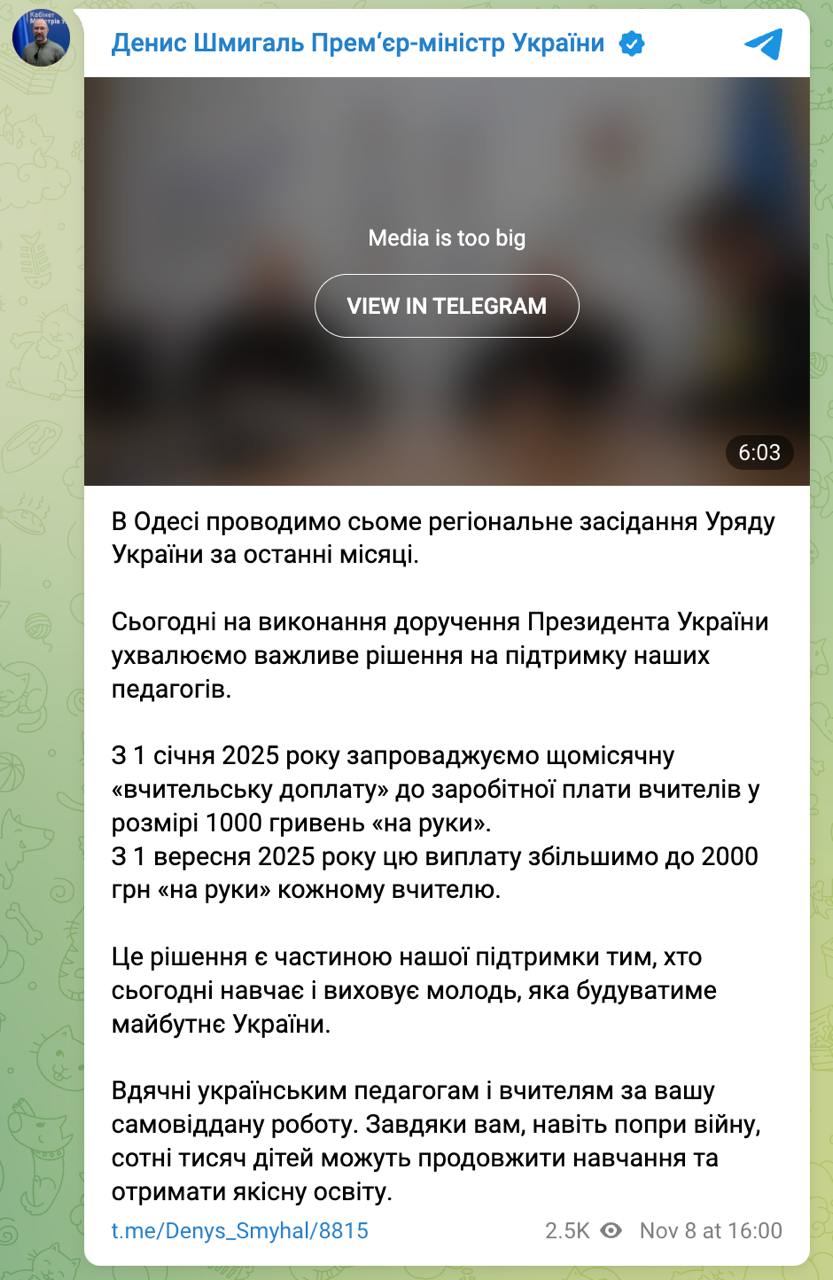 Шмигаль уточнив, що з 1 вересня 2025 року цю виплату збільшать до 2000 грн «на руки» кожному вчителю.