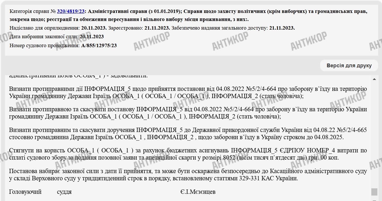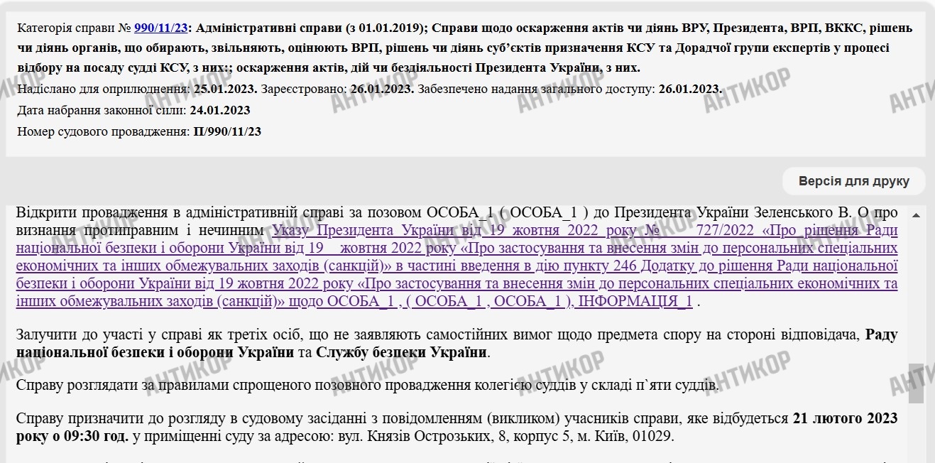 Особливо на тлі того, що сам Михайло Васильович Воєводін теж судиться. Він судиться з президентом України, вимагаючи скасувати Указ від 19 жовтня 2022 р. № 727/2022 в частині введення санкцій відносно Воєводіна Михайла Васильовича. У своєму позові Воєводін посилається на попередні успішні звернення до українського суду, який скасовував рішення СБУ, ГПСУ та ОГПУ про заборону йому на в’їзд до країни. Насторожує в цьому позові той факт, що останнє рішення, яке вдалося відшукати в реєстрах по справі № 990/11/23 – це рішення ВСУ від 24 січня 2023 року про відкриття провадження за позовом Михайла Воєводіна до президента України і призначення слухання справи на 21 лютого 2023 року.
