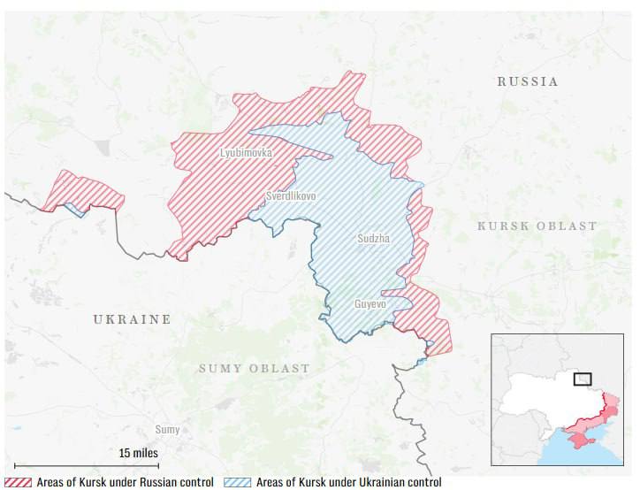 Видання з посиланням на джерела пише, що Кремль також прагне використати свій найбільший контрнаступ у Курській області для того, щоб набрати обертів і просунутися в Сумську область України. РФ вже повернула собі приблизно половину території в Курській області, яку раніше захопила Україна.