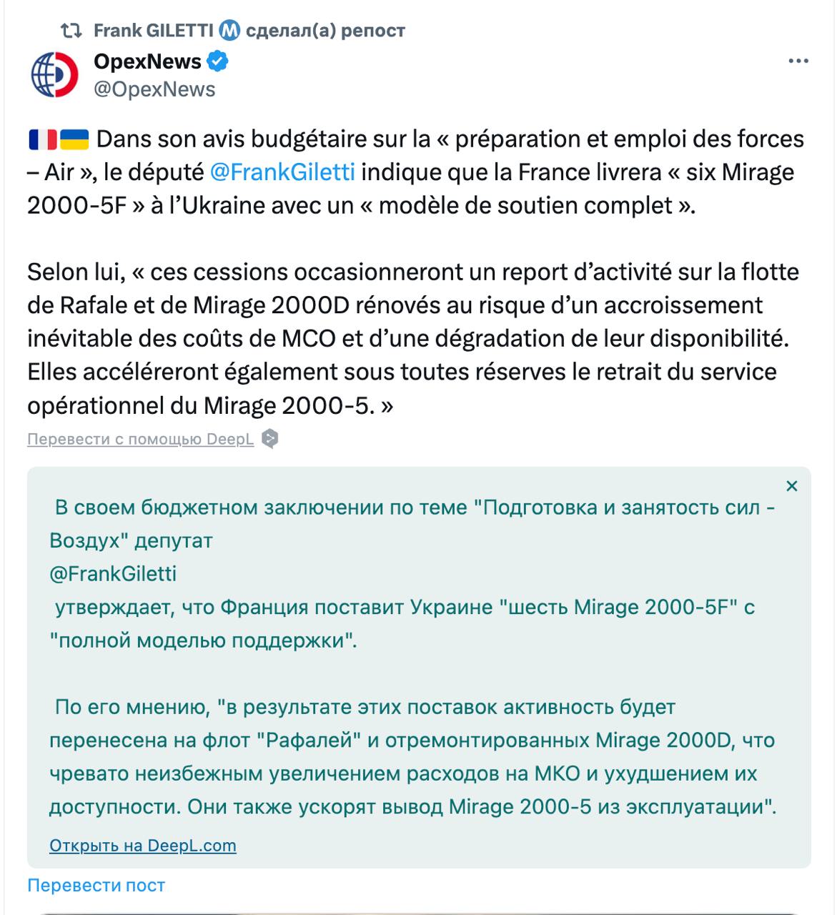 Французький парламентар запевняє, що літаки будуть передані "скоро". Раніше надходила інформація, що це станеться в першому кварталі майбутнього 2025 року. Очікується, що вони прибудуть вже у квітні.