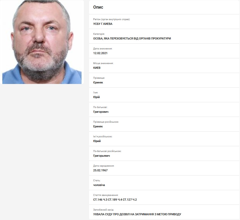 У публічному просторі про висунення підозри Юрію Єриняку та ще чотирьом фігурантам скандальної історії про "викраденого Олега" (ексміністру транспорту, нардепу кількох скликань Миколі Рудьковському, депутату Закарпатської облради Степану Деркачу, очільнику Федерації гандболу України Андрію Мельнику на прізвисько "Длінний" та Андрію Шикорі на псевдо "Каратист") правоохоронці повідомили в день народження авторитетного бізнесмена - 25 лютого 2021 року.