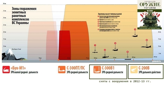 Стоит отметить, что на возможности украинских наземных зенитно-ракетных комплексов сильно влияет их боевая дальность. Так, самый дальнобойный зенитно-ракетный комплекс Украины - С-300ПТ/ПС может вести огонь лишь на 75 километров.
