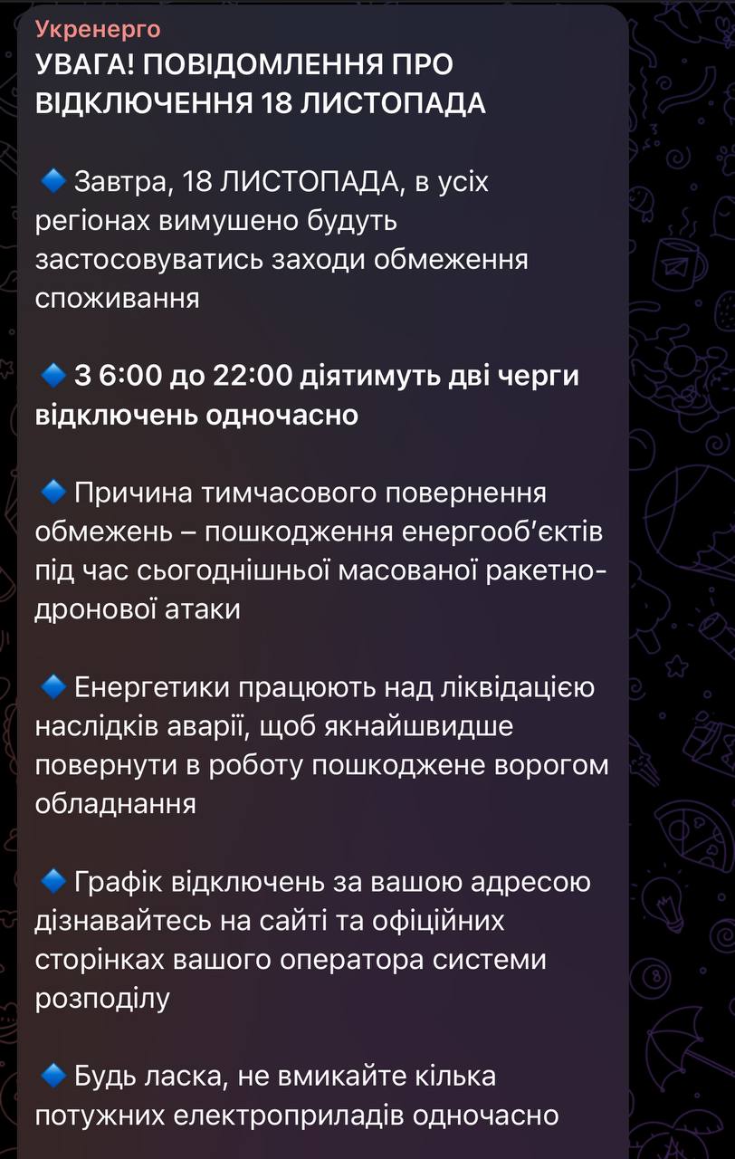 З 6:00 до 22:00 діятимуть дві черги відключень одночасно (відключення в сірих зонах).