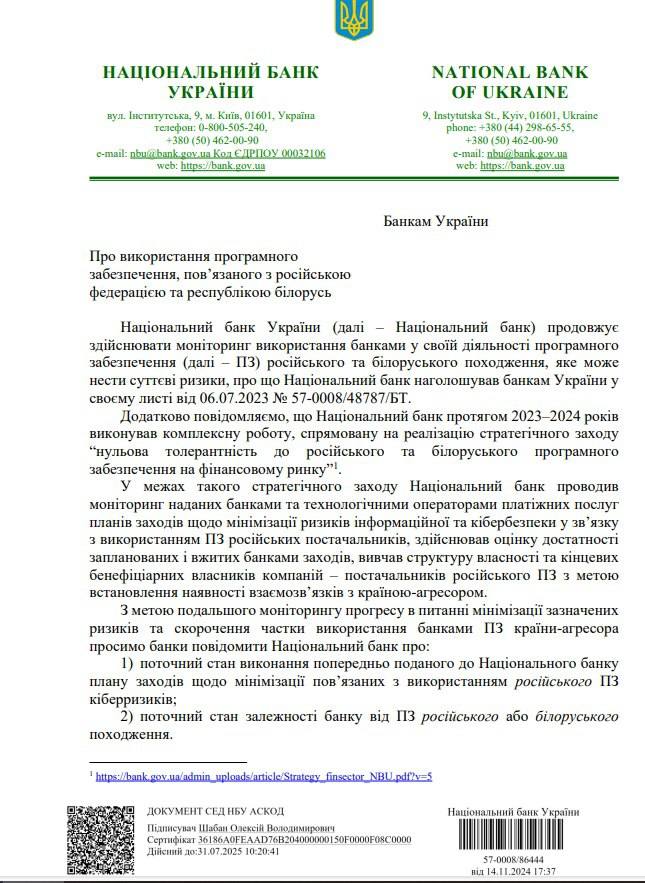Також Національний банк зажадав від банків протягом 21 дня прозвітувати про вирішення проблеми з використанням програмного забезпечення російського та білоруського виробництва.