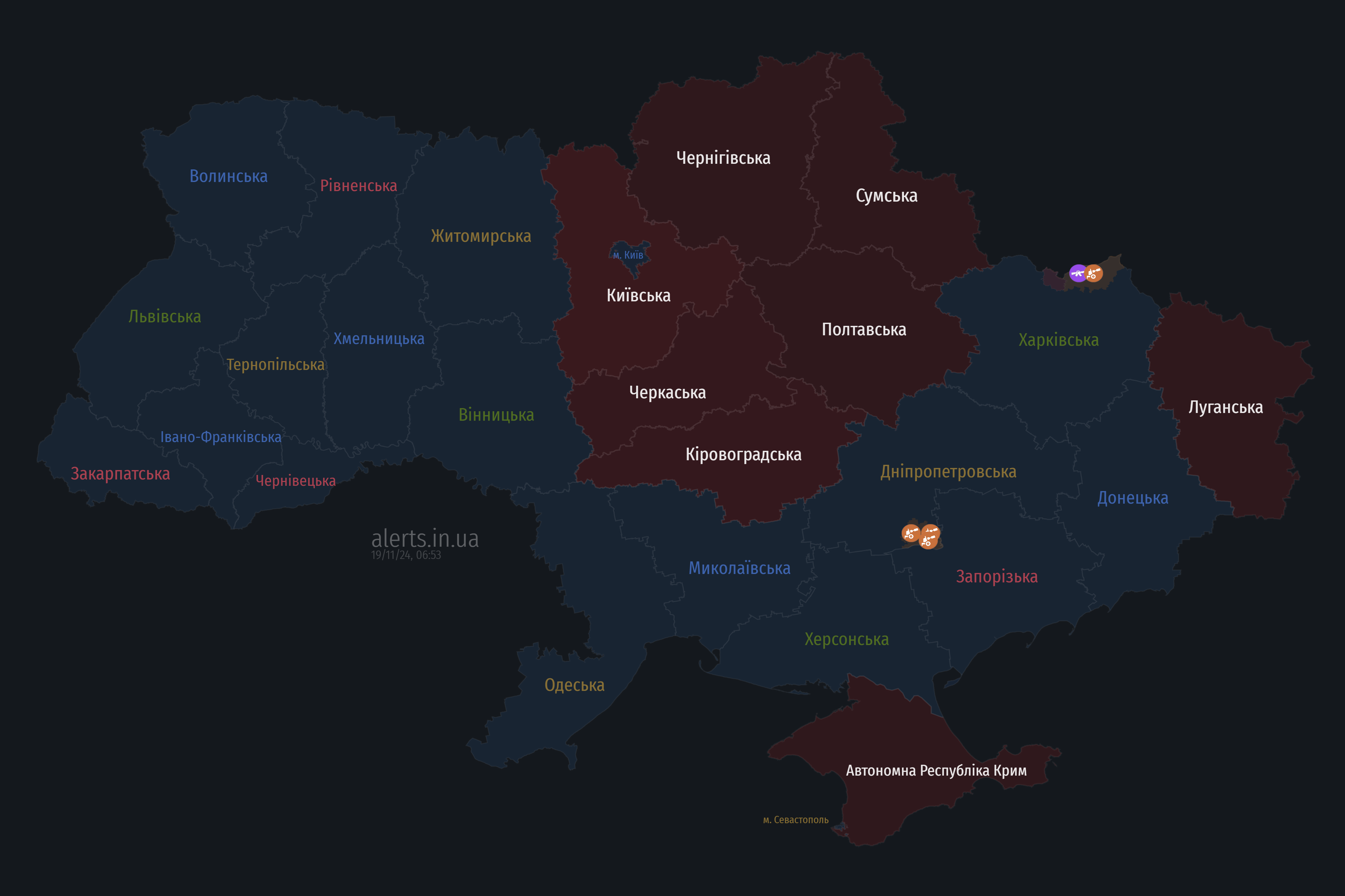 Станом на 06:25 сигнал повітряної тривоги триває у Київській, Житомирській, Вінницькій, Черкаській, Кіровоградській, Полтавській, Чернігівській та Сумській областях. Також темно-червоним кольором позначено Луганську область та окупований Крим.