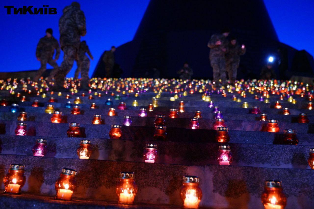 У Києві на тисячний день повномасштабного вторгнення біля підніжжя скульптури "Батьківщина-мати" запалили 1000 свічок.