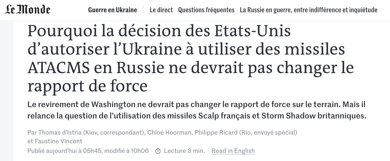 Раніше США дали згоду на удари своїми далекобійними ракетами по російській території, проте Франція та Британія поки цього не зробили.