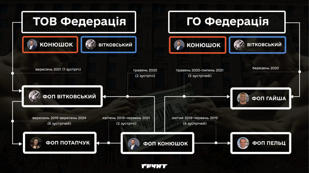 Схоже, що команда стронгменів найбільш орієнтована на конкурсні пропозиції від Департаменту освіти, науки, молоді та спорту Київради. З 2017 по 2021 рік Конюшок отримав контрактів на близько 9,7 мільйонів гривень, 5 із яких — від Київради. Вітковський у 2019—2024 роках отримав договорів на більш ніж 9 мільйонів гривень, 7,1 з яких — від Київради. Потапчук отримала від Київради половину від своїх виграшів у 2,8 мільйона гривень, Пельц — 2,7 мільйона гривень з 3,2 мільйонів гривень, а Гайша — 693 тисяч гривень з 843 тисяч гривень. За вісім років колегам по федерації удалось отримати контракти на загальну суму понад 31 мільйон гривень.