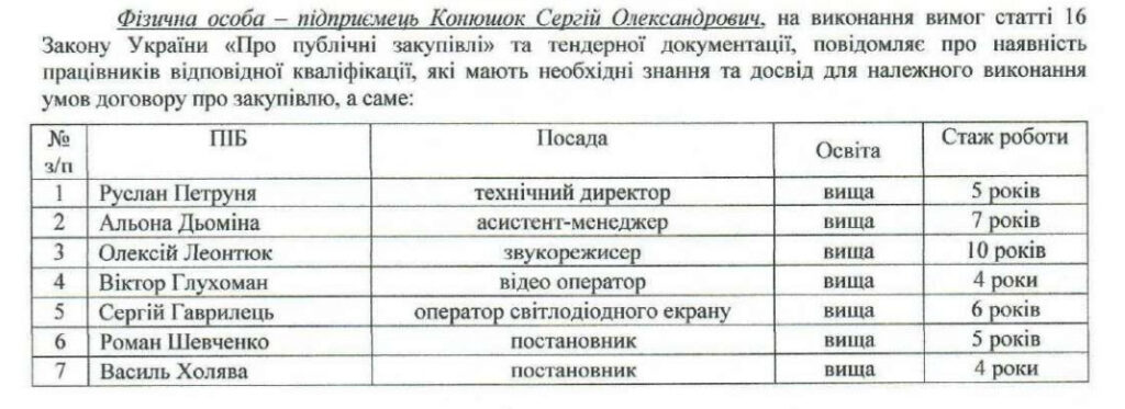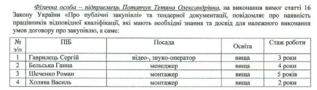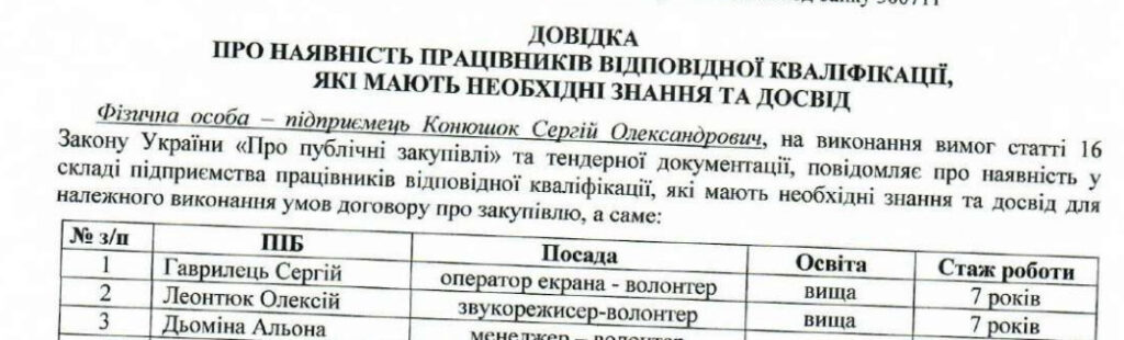 Цікаві моменти є і в самих тендерних пропозиціях. Наприклад, однаково підписані назви документів. Або ж спільні співробітники у довідці про наявність працівників, що мають відповідну кваліфікацію для надання послуг.