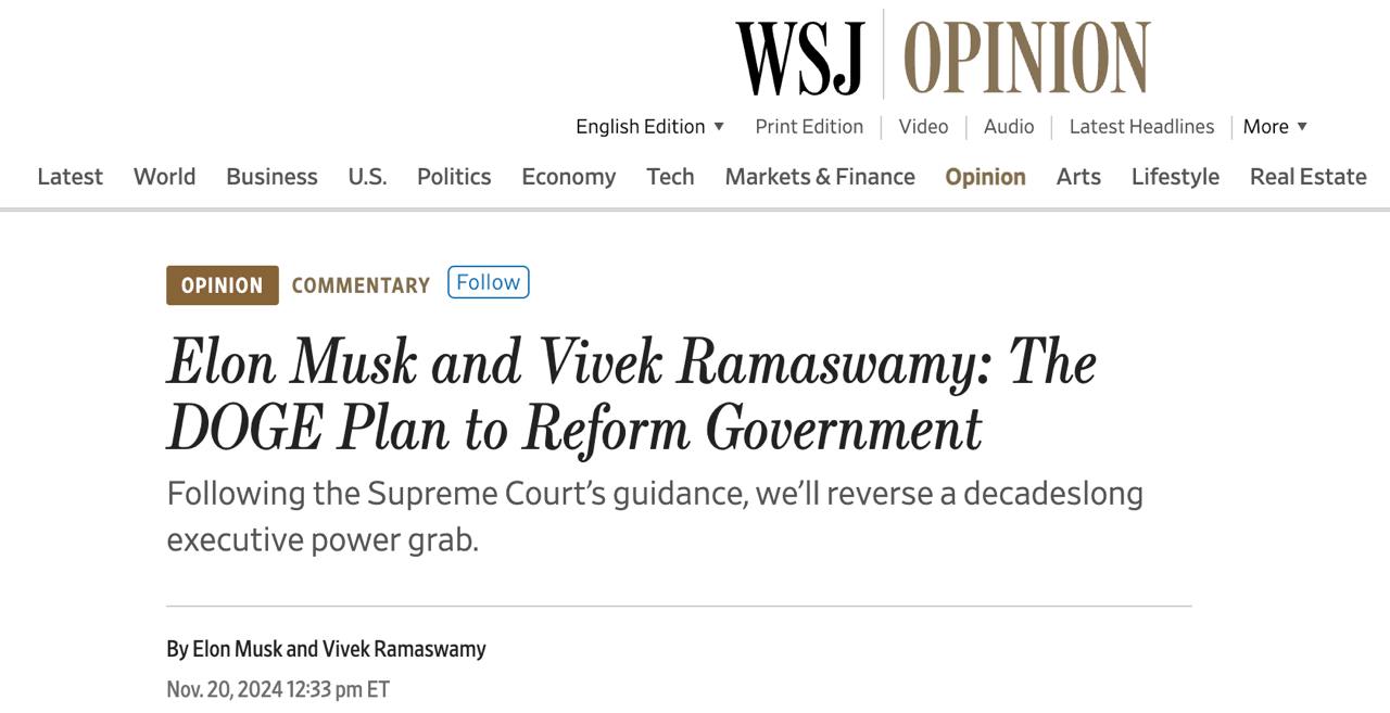 Майбутні керівники Департаменту державної ефективності при Трампі представили свій план радикальної економії для США на сторінках The Wall Street Journal.