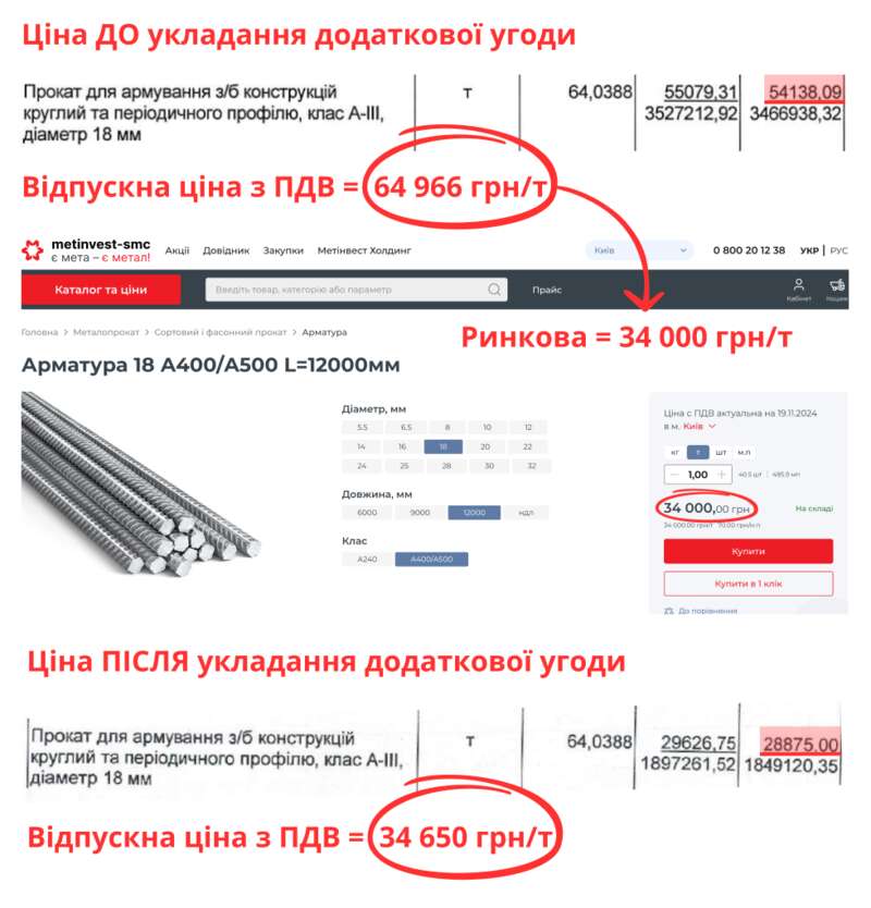 Раніше у підсумковій відомості ресурсів найбільша сума 8,33 млн грн припадала на сталеву арматуру періодичного профілю класу А-ІІІ різних діаметрів по 44 138-54 138 грн/т (тут і далі ціни та суми вказано з ПДВ). Це на 56-91% дорожче від ринкових цін. Після укладення додаткової угоди ціна арматури знизилась до 34 650 грн/т, що на рівні ринку.