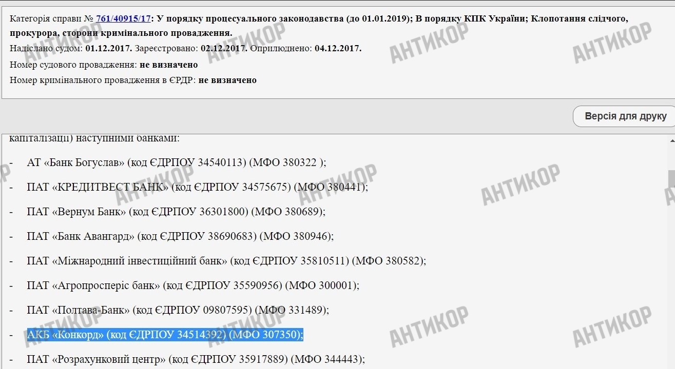Не привела ні до чого і кримінальна справа за фактом отримання «Конкорд банком» майже мільярда гривень рефінансування від НБУ. Причому отримував ці гроші «Конкорд» вже після того, як потрапив під санкції Мінфіну США за причетність до фінансування тероризму та участь у схемах з виведення грошей від продажу наркотиків. А останній транш від НБУ «Конкорд» взагалі отримав за кілька місяців до банкрутства, що теж викликає великі питання.