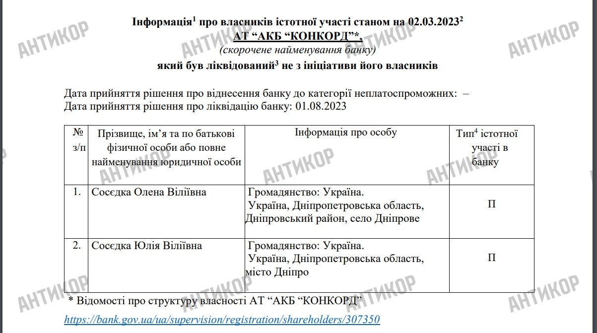 Причому заснований банк у 2006 році, а його історія простежується тільки з 2012-го, коли його власниками офіційно стали Юлія та Олена Сосєдки. Відомо тільки, що спочатку банк входив до групи компаній Concord Capital, заснованих Ігорем Коломойським та Ігорем Мазепою у 2006 році. Що теж викликає великі питання і вельми цікаво. В’ячеслав Мішалов офіційним власником банку не значиться, тому формально відповідати мають його екс(?) дружина Олена Сосєдка та її сестра Юлія Сосєдка.