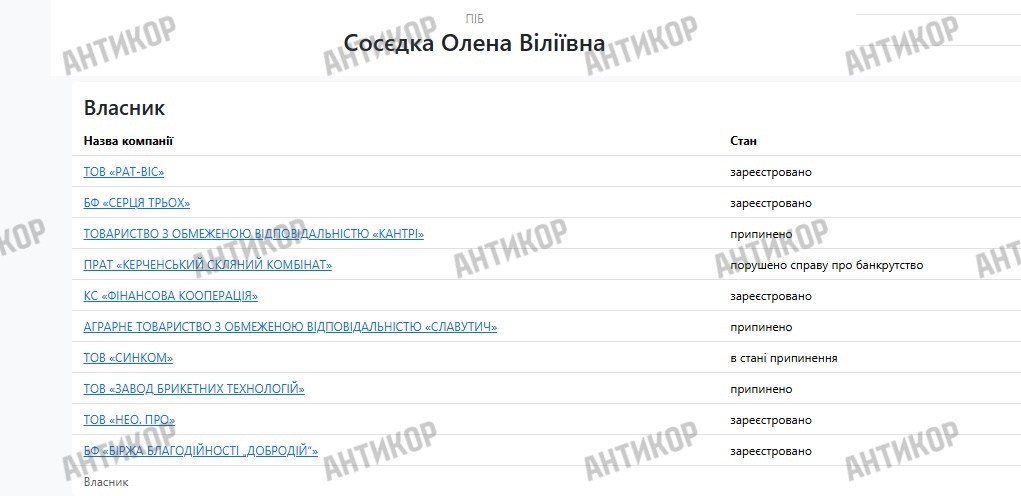 Олена Сосєдка є власницею кількох фірм, серед яких є кредитна спілка (мікрофінансова організація) і кілька благодійних фондів.