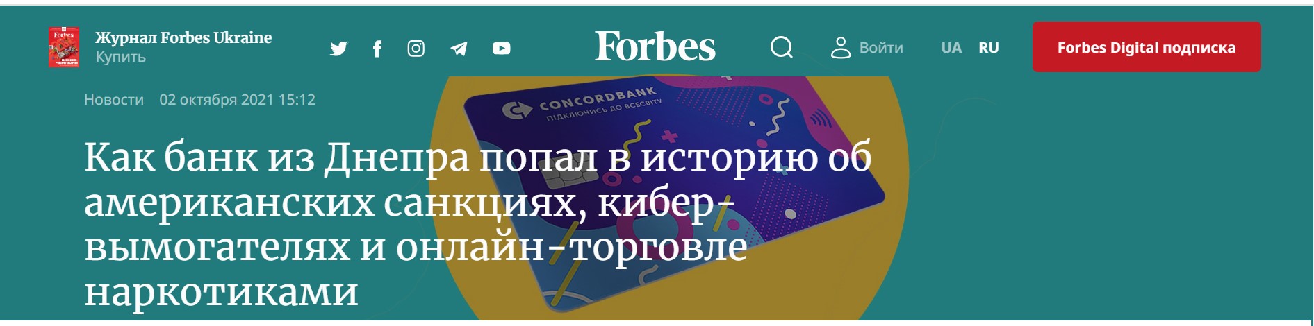 Банк навіть потрапляв з цього приводу в розслідування Мінфіну США, за підсумками якого він потрапив у вересні 2021 року під санкції цієї країни за «роботу з російським криптообмінником SUEX. У схемі був залучений криптообмінник SUEX, найбільша криптовалютна біржа Східної Європи ExMo, група компаній QIWI та український ConcordBank». Саме через «Конкорд» йшли платежі російських громадян для найбільшої в даркнеті платформи з продажу наркотиків Hydra, оборот якої в Росії становить не менше півтора мільярда доларів на рік.