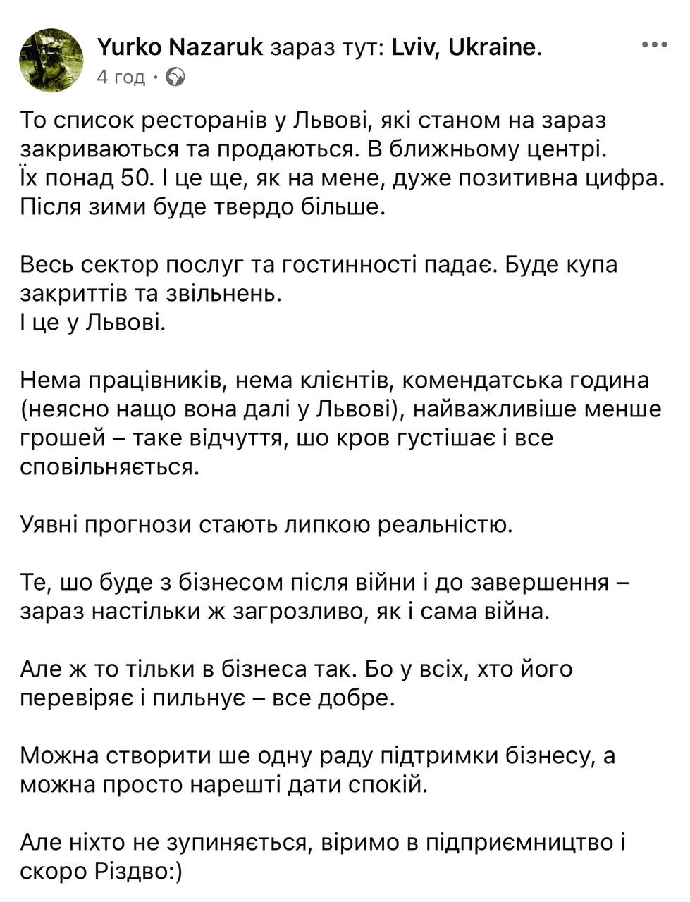"Це список ресторанів у Львові, які наразі зачиняються та продаються. У ближньому центрі. Їх понад 50. І це, на мій погляд, надто оптимістичне число. Після зими буде значно більше", – зазначив він.