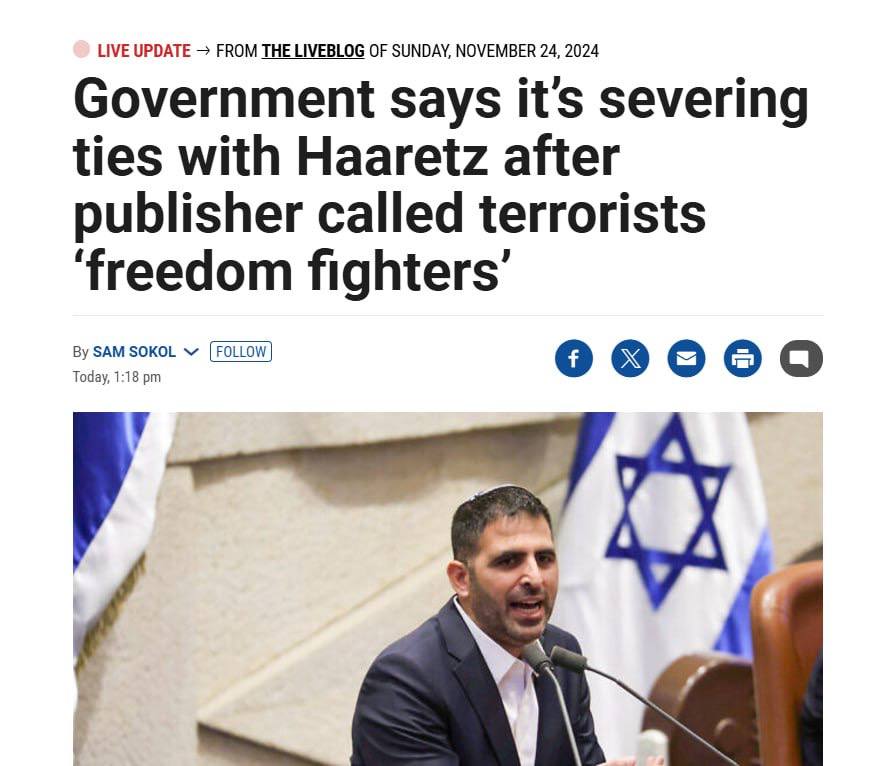 Крім того, як повідомляється, на рішення уряду вплинули останні заяви видавця "Гаарец" Амоса Шокена на конференції видання в Лондоні. Він назвав ізраїльське правління "жорстоким режимом апартеїду" та схарактеризував деяких членів палестинських бойових угруповань як "борців за свободу".