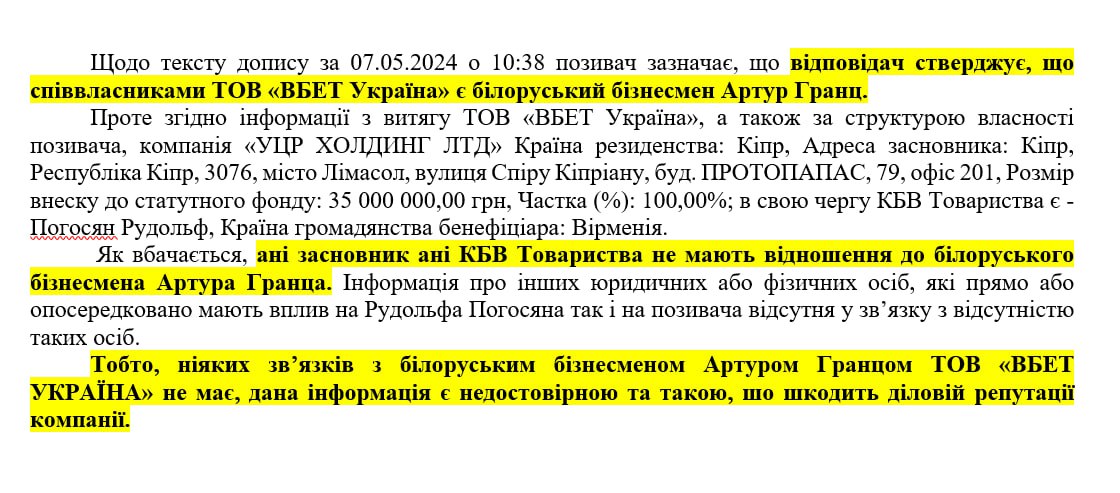 «Ніяких зв’язків з білоруським бізнесменом Артуром Гранцом ТОВ «ВБЕТ УКРАЇНА» не має, дана інформація є недостовірною та такою, що шкодить діловій репутації компанії».