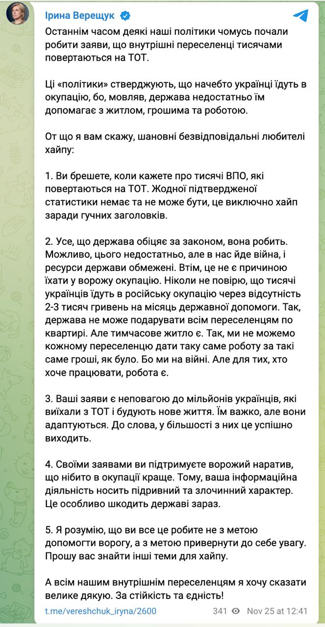 "Все, що держава зобов’язана робити за законом, вона виконує. Можливо, цього недостатньо, але в нас йде війна і ресурси держави обмежені. Однак це не причина їхати у ворожу окупацію. Ніколи не повірю, що тисячі українців їдуть в російську окупацію через нестачу 2-3 тисяч гривень на місяць державної допомоги. Так, держава не може подарувати усім переселенцям по квартирі. Але тимчасове житло є. Так, ми не можемо кожному переселенцю надати таку ж роботу з такою ж зарплатою, як було. Тому що ми на війні. Але для тих, хто хоче працювати, робота є", - заявляє заступник голови Офісу президента.