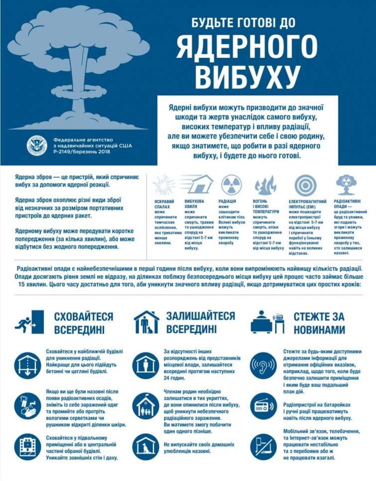 ЗМІ зібрали рекомендації Міністерства охорони здоров’я, Американського Червоного Хреста, Університету Джонса Гопкінса та поспілкувалися з кандидаткою біологічних наук і засновницею науково-популярного блогу ChornobylInsight Катериною Шавановою, щоб дізнатися, як можна підготуватися і що робити, аби зменшити наслідки можливого ядерного вибуху.