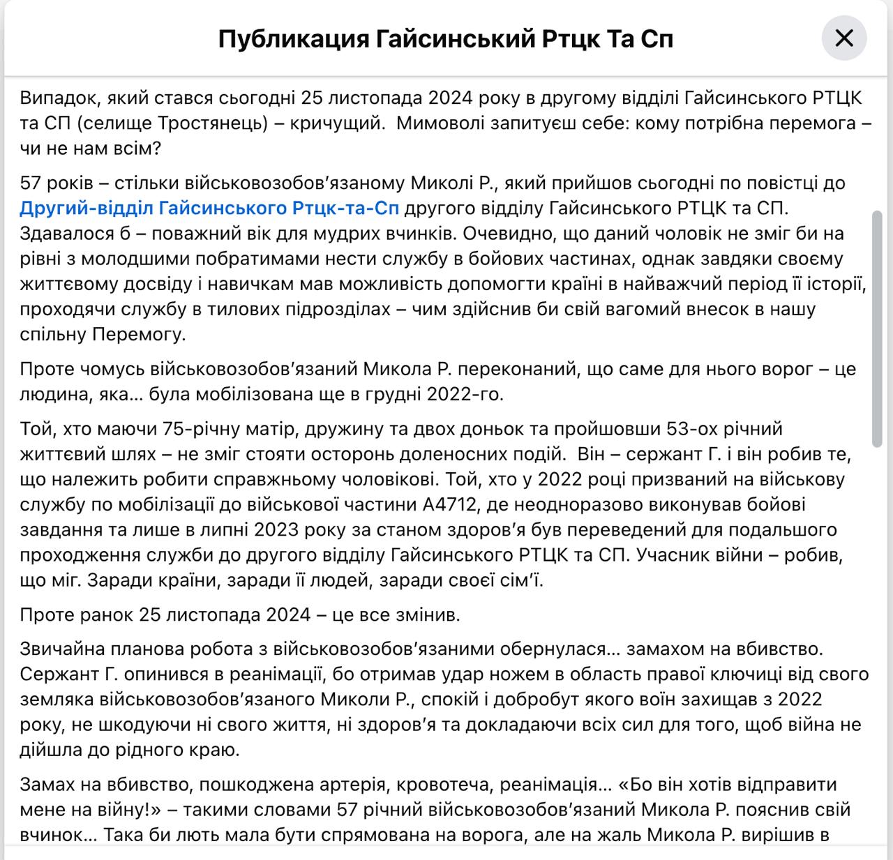 У Тростянці Вінницької області 57-річний мобілізований чоловік наніс ножове поранення співробітнику ТЦК, повідомляє військкомат.