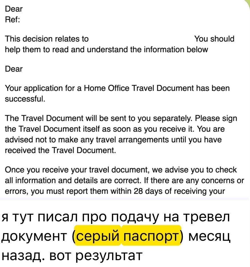 «Я вже писав про подачу на тревел-документ (сірий паспорт) місяць тому. Ось результат», - ділиться один з користувачів соцмереж, прикріплюючи лист від британської влади, свідчить про те, що йому схвалили видачу «сірого паспорта».