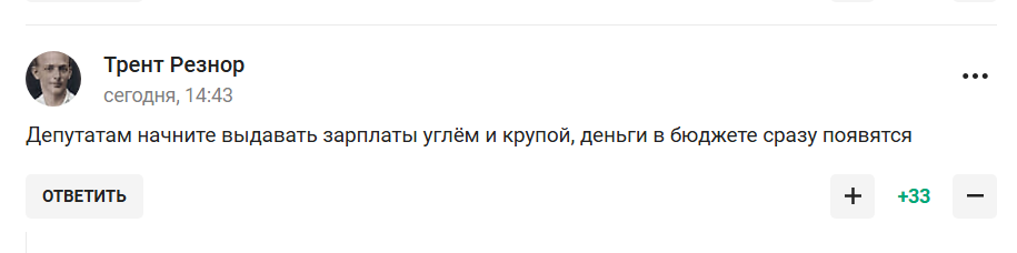 "Чудово, коли на спорт грошей немає, на охорону здоров’я немає, на освіту немає, а на зброю і бомби є", "Давайте не дискредитуйте тут, у СВОлогічні часи не до штурхання м’яча, лікування або навчання. Потрібно всіма силами намагатися ось-ось "звільнити" українське село, після чого точно перемога буде за нами..." – глузують користувачі.