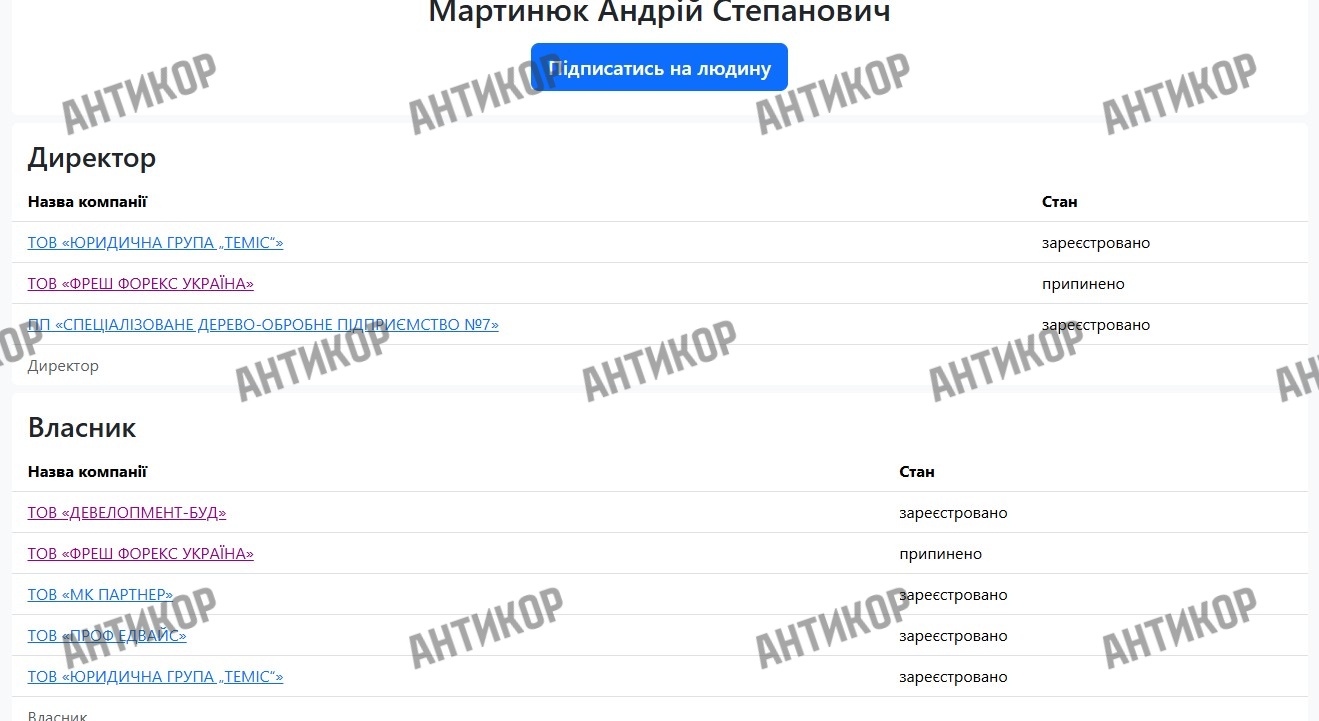 Той факт, що для Мартинюка і Fresh Forex Ukraine всі загрози поліції та прокуратури закінчилися нічим, підтверджує й аналіз судових реєстрів. Вони повні прізвища Мартинюк, але серед численних судових справ немає жодної кримінальної. Спори за майно, землю, величезна кількість позовів Мартинюка до різноманітних видань про «захист честі та гідності», але – жодного кримінального провадження. Ба більше – є позов Андрія Мартинюка до Національної поліції України з вимогою стягнути з неї 18 450 гривень «матеріальних збитків». Мартинюк стверджує, що майно, вилучене в офісі його ТОВ «Проф едвайс» під час обшуків у 2021 році, було повернуто йому зі значними пошкодженнями. Які він оцінив у 18 450 гривень.