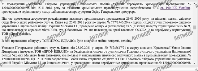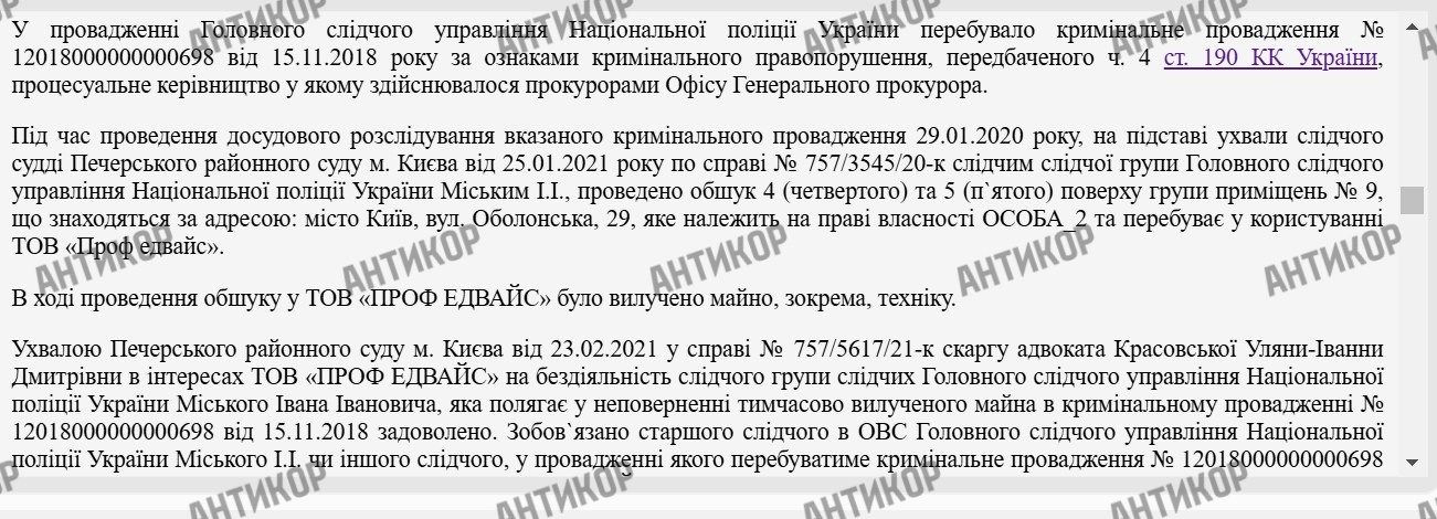 Щоправда, суд йому у вимозі відмовив, але це ще не остаточне рішення – справа перебуває в касаційній інстанції. Але зате з цього рішення суду стає відомо, що стосовно Андрія Мартинюка і його компанії ТОВ «Проф едвайс» таки є кримінальна справа. Вона порушена ще в 2018 році за частиною 4 статті 190 КК України (Шахрайство в особливо великих розмірах) за №12018000000000698. Відстежити долю цієї кримінальної справи у відкритих реєстрах не вдалося, але, судячи з тексту рішення господарського суду, вилучену техніку Мартинюку повернули, а справа розвалилася.