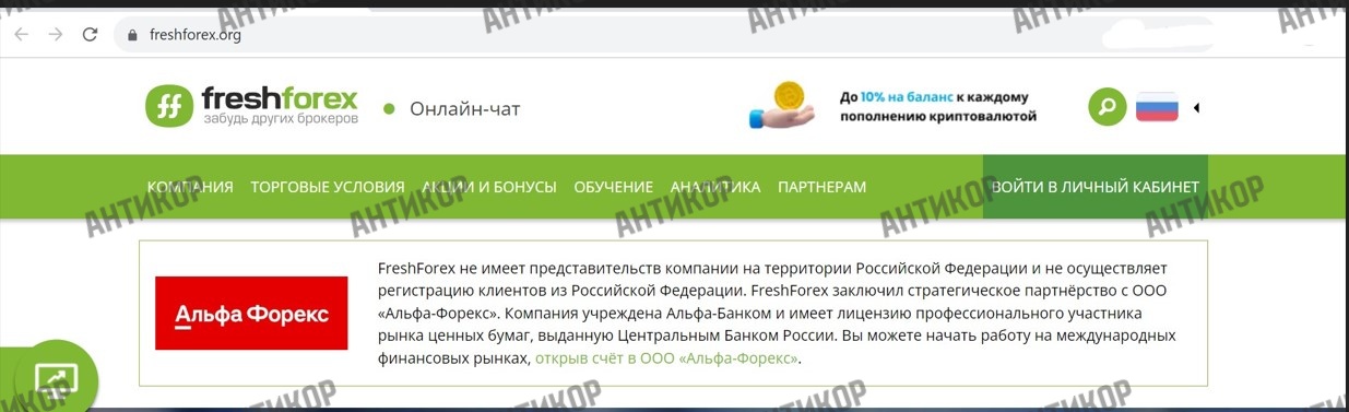 Що цікаво у цьому зв’язку – ще в минулому році на головній сторінці FreshForex Ukraine висів банер з інформацією про те, що «FreshForex не має представництв компанії на території Російської Федерації». Хоча буквально через три слова говорилося наступне: «FreshForex уклав стратегічне партнерство з ТОВ «Альфа-Форекс». Компанія заснована "Альфа-Банком" і має ліцензію професійного учасника ринку цінних паперів, видану Центральним банком Росії. Ви можете почати роботу на міжнародних фінансових ринках, відкривши рахунок у ТОВ «Альфа-Форекс». Тепер цього банера немає. Що означає, що посередник у вигляді «Альфа групп» Михайла Фрідмана та Германа Хана більше не потрібен.