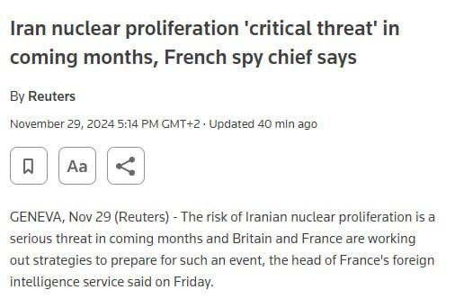 Таку інформацію повідомляє Reuters, посилаючись на керівника Служби зовнішньої розвідки Франції Ніколя Лернера.
