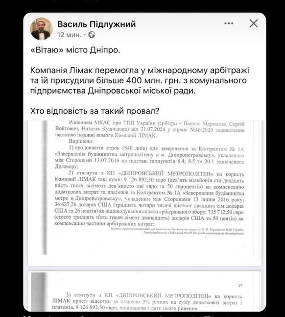 Міжнародний комерційний арбітражний суд при Торгово-промисловій палаті України частково задовольнив позовні вимоги турецької компанії «Лімак», яка будувала метро у Дніпрі, до КП «Дніпровський метрополітен» щодо продовження строку виконання контракту та стягнення з КП «Дніпровський метрополітен» додаткових коштів.