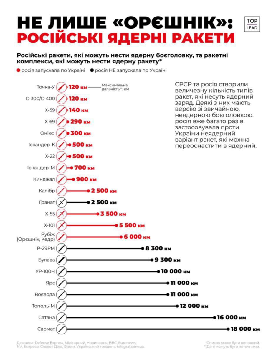 13 із них вже були застосовані проти України з традиційними боєголовками, включно з ракетою «Орєшнік».