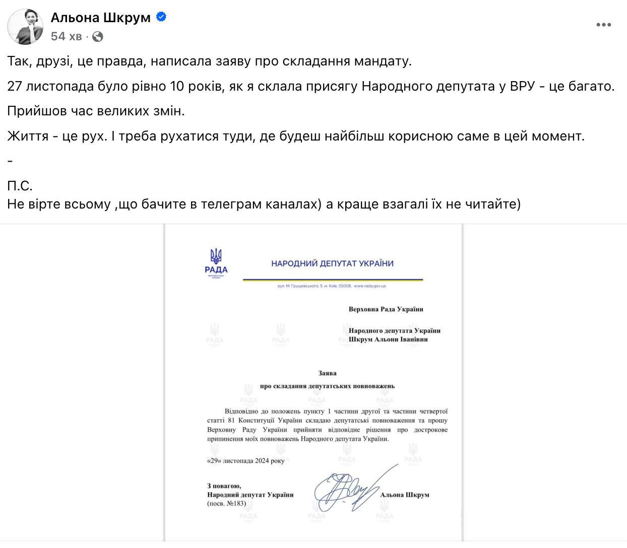 "Так, друзі, це правда, написала заяву про складання мандату. 27 листопада було рівно 10 років, як я склала присягу Народного депутата у ВРУ, це багато. Прийшов час великих змін. Життя це рух. І треба рухатися туди, де будеш найбільш корисною саме в цей момент", - написала Шкрум.