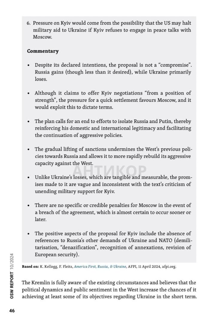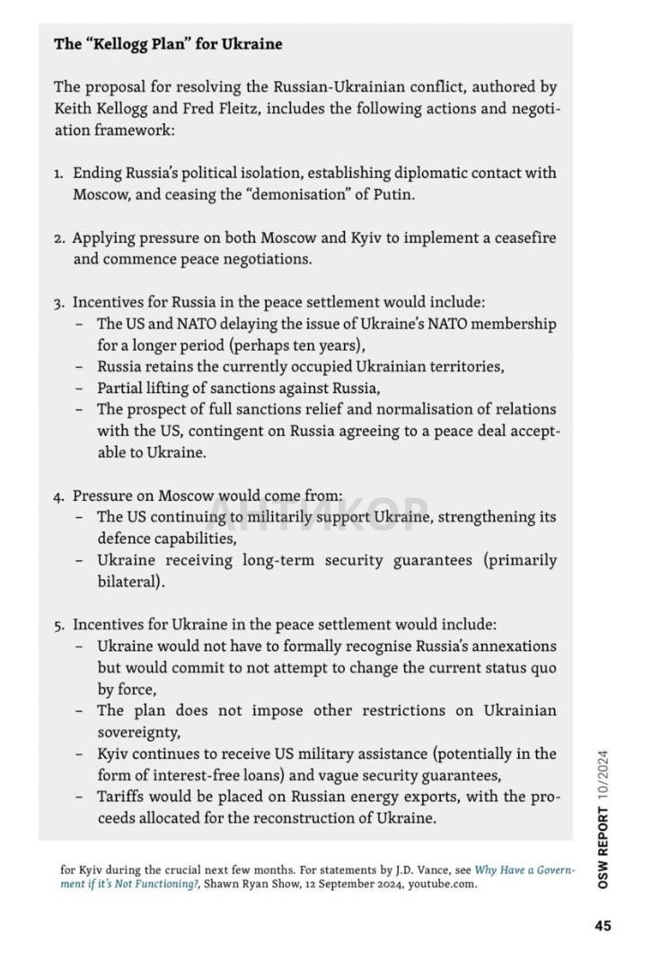 Нагадуємо, що раніше ми вже публікували цей план, але є нові доповнення: документ, складений у квітні 2024 року, набув актуальності після призначення генерала Кіта Келлога спецпосланцем США по Україні. Основні положення:
