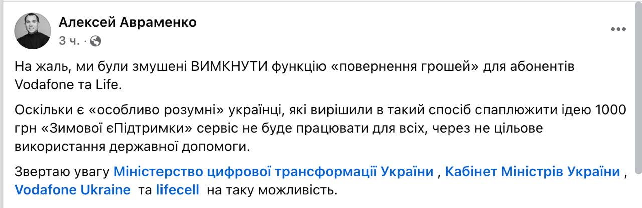 Дехто почав поповнювати свої мобільні рахунки, а потім запитувати повернення коштів. Ця можливість була доступна для абонентів Vodafone і Life, але наразі її довелося відключити.