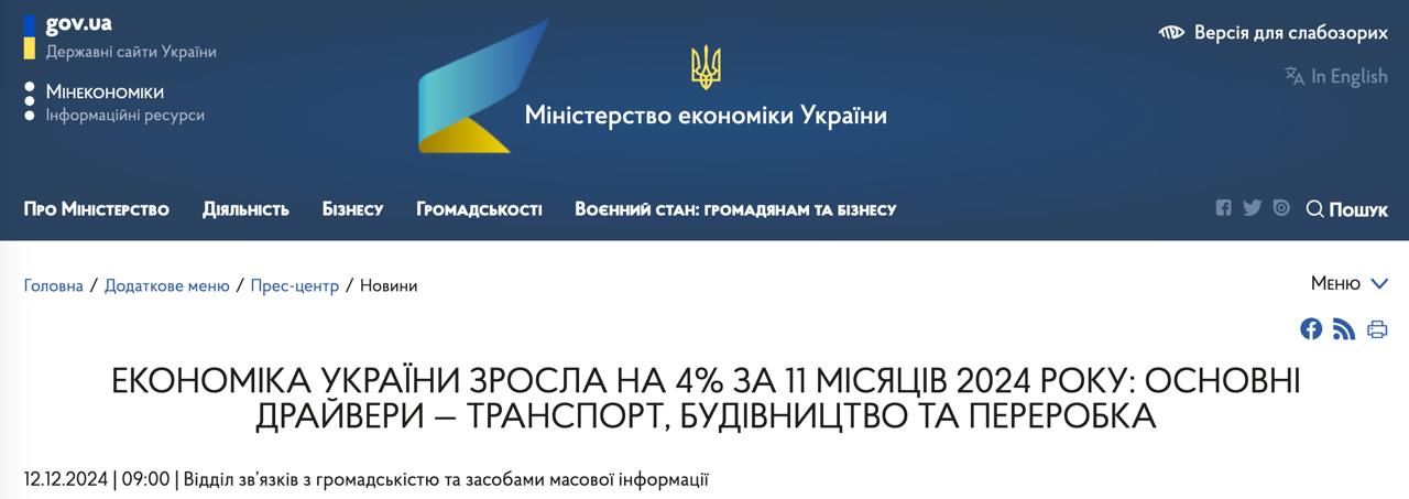 За даними Мінекономіки, економіка України за 11 місяців 2024 року зросла приблизно на 4%. Однак в останні місяці темпи зростання значно знизилися.