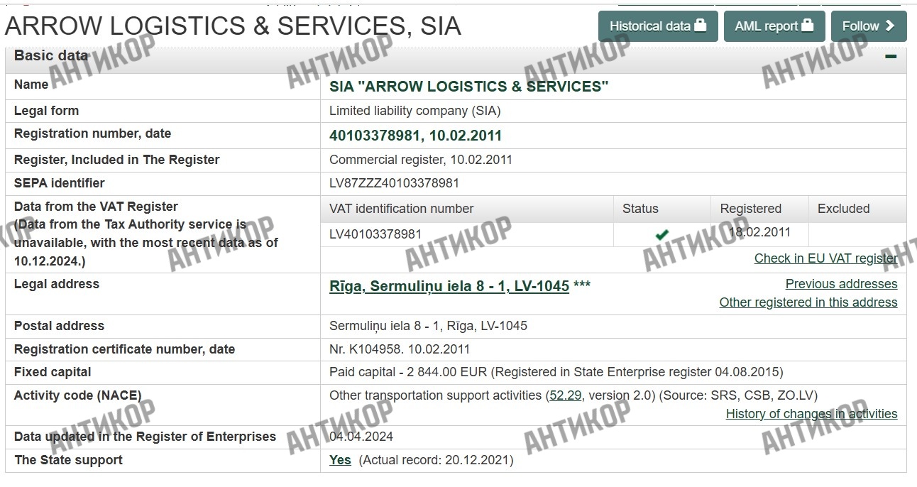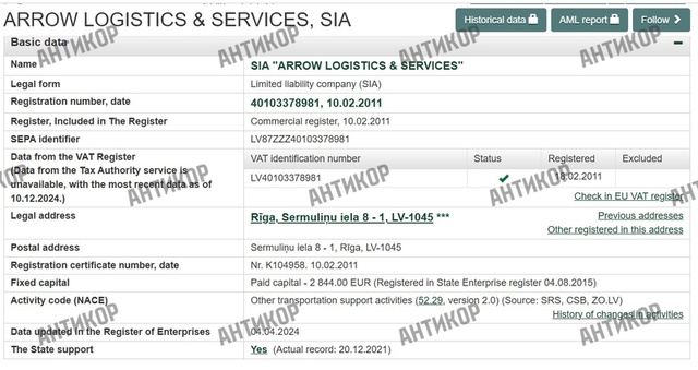 Компанія-постачальник - SIA ARROW LOGISTICS & SERVICES, зареєстрована в Ризі.