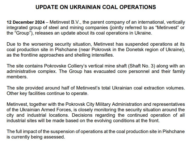 Інші об’єкти компанії в Покровську функціонують без змін. Представник «Метінвесту» уточнив для агентства Reuters, що продовжують працювати дві інші шахти, які знаходяться на більшій відстані від лінії фронту.