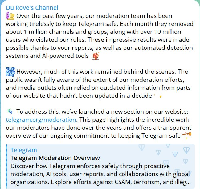 За його словами, за останні кілька років компанія щомісячно видаляла близько 1 мільйона каналів і груп, а також понад 10 мільйонів облікових записів користувачів, які порушували правила платформи. Цей захід спрямований на поліпшення модерації і усунення протиправного контенту, який негативно впливає на репутацію месенджера.