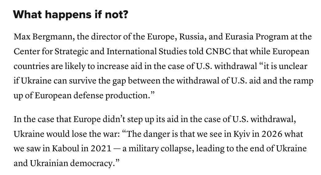 На думку Бергманна, «незрозуміло, чи зможе Україна витримати розрив між закінченням американської допомоги та зростанням європейського виробництва оборонного призначення».