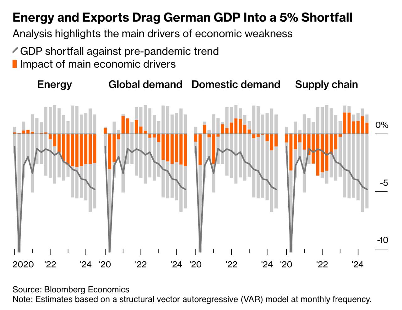 Економіка ФРН після п’яти років застою зараз на 5% менша, ніж могла б бути, якби зберігалися темпи зростання до пандемії. Це криза найбільша з моменту возз’єднання ФРН і НДР.