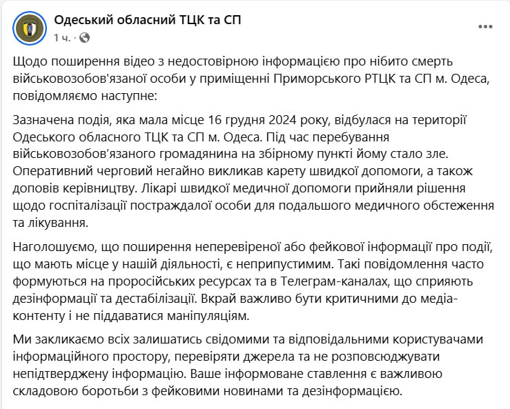 Одеський ТЦК спростував інформацію про смерть мобілізованого