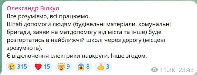 Він зазначив, що «в окрузі вимкнули електрику», і додав, що буде організовано штаб допомоги людям будівельними матеріалами та фінансовою підтримкою.