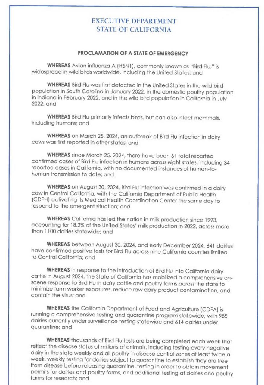 Ґевін Ньюсом, губернатор Каліфорнії, оголосив надзвичайний стан у штаті на тлі зростання випадків захворювання на пташиний грип. Це рішення було прийнято у відповідь на збільшення кількості випадків захворювання в Каліфорнії та по всій території США.
