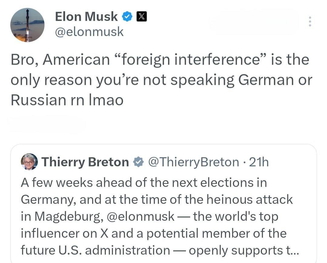 «За кілька тижнів до виборів у Німеччині і в світлі жахливого нападу на Магдебург Ілон Маск, найбільш впливова фігура на платформі X і можливий член майбутньої адміністрації США, відкрито висловив підтримку крайньо правій партії "АдГ". Хіба це не є класичним прикладом втручання з-за кордону? Ми повинні усунути подвійні стандарти», - написав Бретон в X.