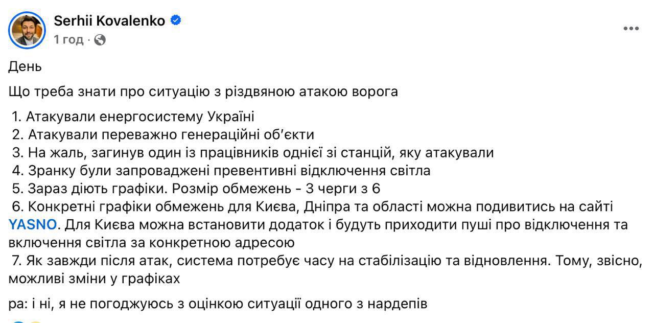 Він також зазначив, що «не погоджується з оцінкою ситуації окремих нардепів», маючи на увазі заяву Сергія Нагорняка про некритичні пошкодження енергосистеми.
