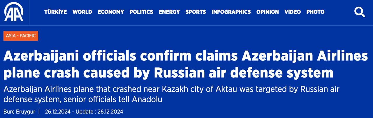 Турецьке видання Anadolu повідомляє, що азербайджанський літак був збитий російською системою ППО.