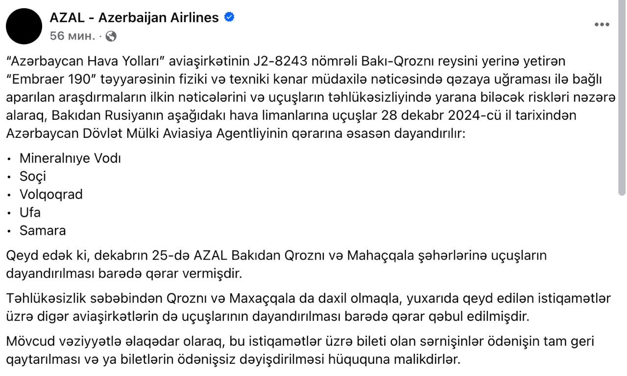 "На основі попередніх результатів розслідування катастрофи літака ..., викликаної фізичним і технічним зовнішнім втручанням, і враховуючи ризики для безпеки польотів, Агентство цивільної авіації Азербайджану ухвалило рішення з 28 грудня 2024 року призупинити рейси з Баку до аеропортів Росії: Мінеральні Води, Сочі, Волгоград, Уфа, Самара", – йдеться в офіційній заяві.