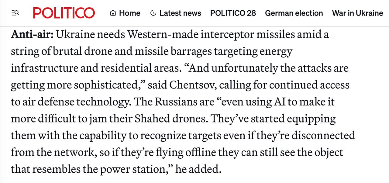 За словами посла України в ЄС Всеволода Ченцова, Росія розпочала оснащення "шахедів" штучним інтелектом, повідомило Politico.